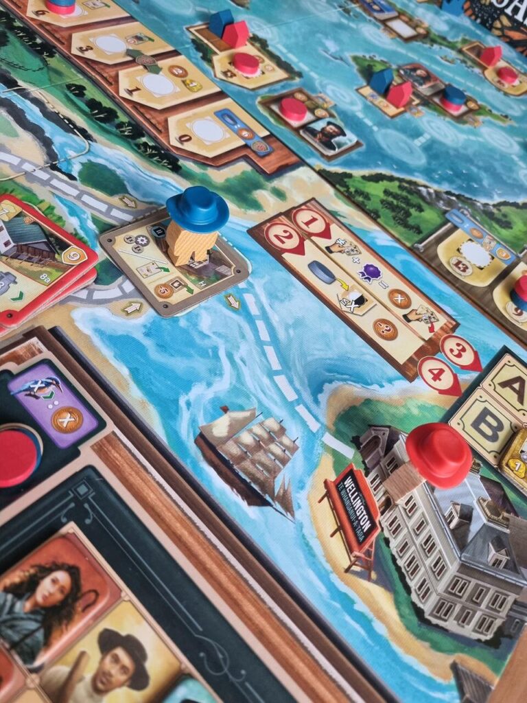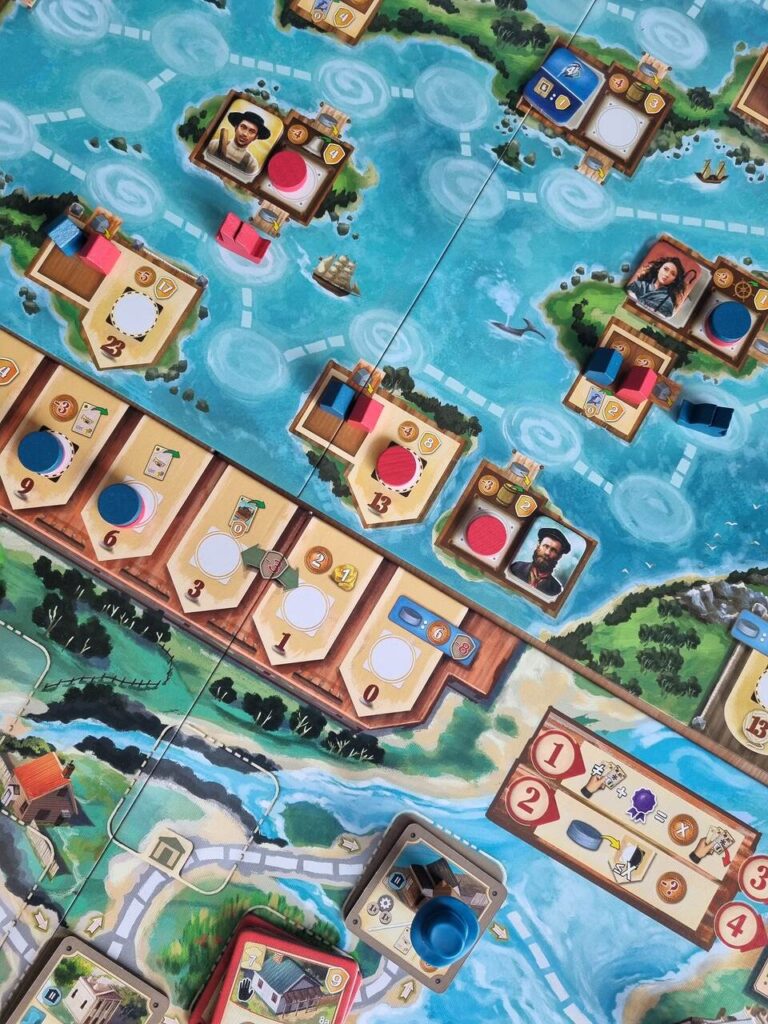 Naszymi łajbami będziemy mogli dokować do portów zdobywając nowe żetony punktujące oraz karty deck buildingowe. W niektórych portach będziemy mogli też wznieść magazyny, które po zbudowania zapewnią nam różne premie. Sprawi to też, że podczas doręczanie lub strzyżenia będziemy mogli rozstawić nasze dyski rozwoju w zupełnie nowych miejscach.