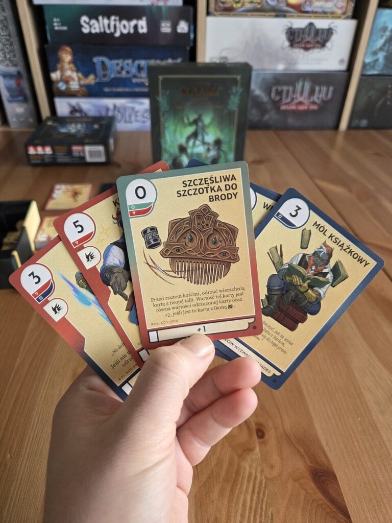 Co do samej walki to fajnie, że łączy ona karty z kośćmi. Bo zagrywając karty wiemy ile zadamy obrażeń, a dzięki kością możemy dorzucić coś jeszcze do naszej próby. Tylko pytanie czy nam się uda? Świetnie jest to takie lekkie kuszenie szczęścia. Bo pojawiają się rozmowy w stylu „nie zagrywaj tej karty bo i tak brakuje nam tylko 1 do sukcesu”, a później wychodzi jak wychodzi :P. Satysfakcja z powiedzenia komuś, „a nie mówiłem” jest ogromna.