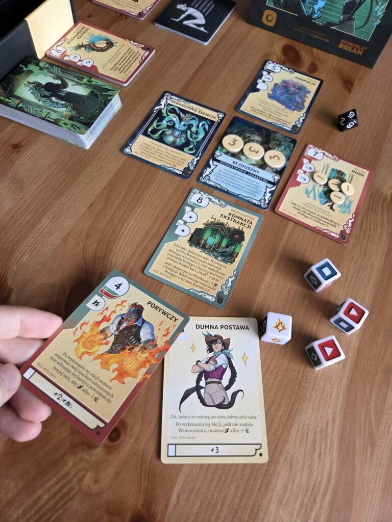 Takim fajnym mykiem jest też to, że nie uzupełniamy naszej ręki po zagraniu kart. By to zrobić musimy się zmęczyć, a to prowadzi do tego, że dobierzemy kartę wyczerpania. Dlatego zagrywając nasze karty trzeba sobie oszacować czy warto wypstrykać się ze wszystkiego czy może liczyć na innych współgraczy lub nasze szczęście w kościach.