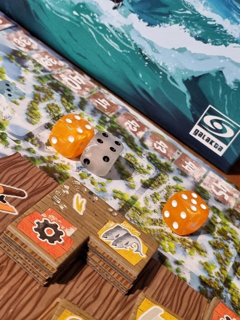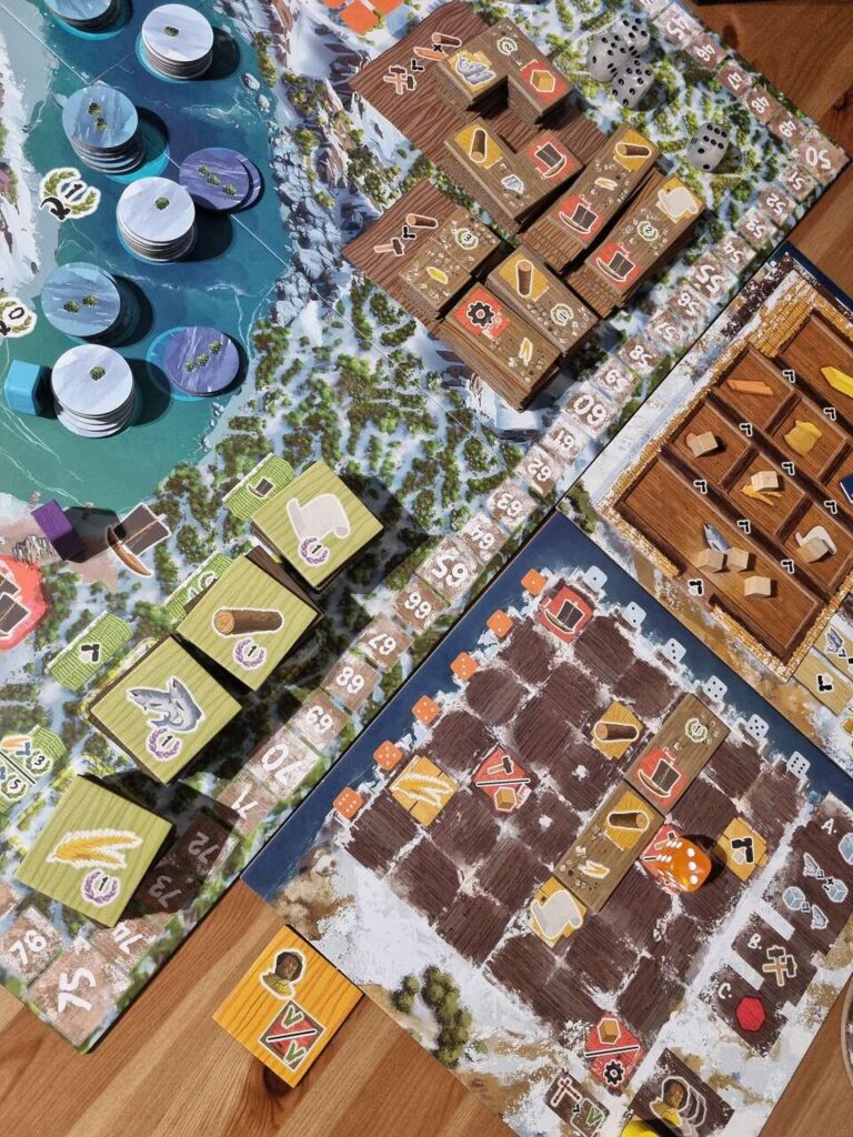 Najlepszą rzeczą w tej grze jest to, że możemy dodawać nowe akcje w kolumnach oraz rzędach naszej wioski. Jest to swoista mini gierka, gdzie staramy się zapełnić naszą planszę nowymi kafelkami by móc robić jak najwięcej akcji z umieszczenia jednej kości. Przez to czuć, że z rundy na rundę możemy zrobić więcej. Ustawianie nowych kafelków może też dać nam spory zastrzyk zasobów jak odpowiednio sobie to zaplanujemy.