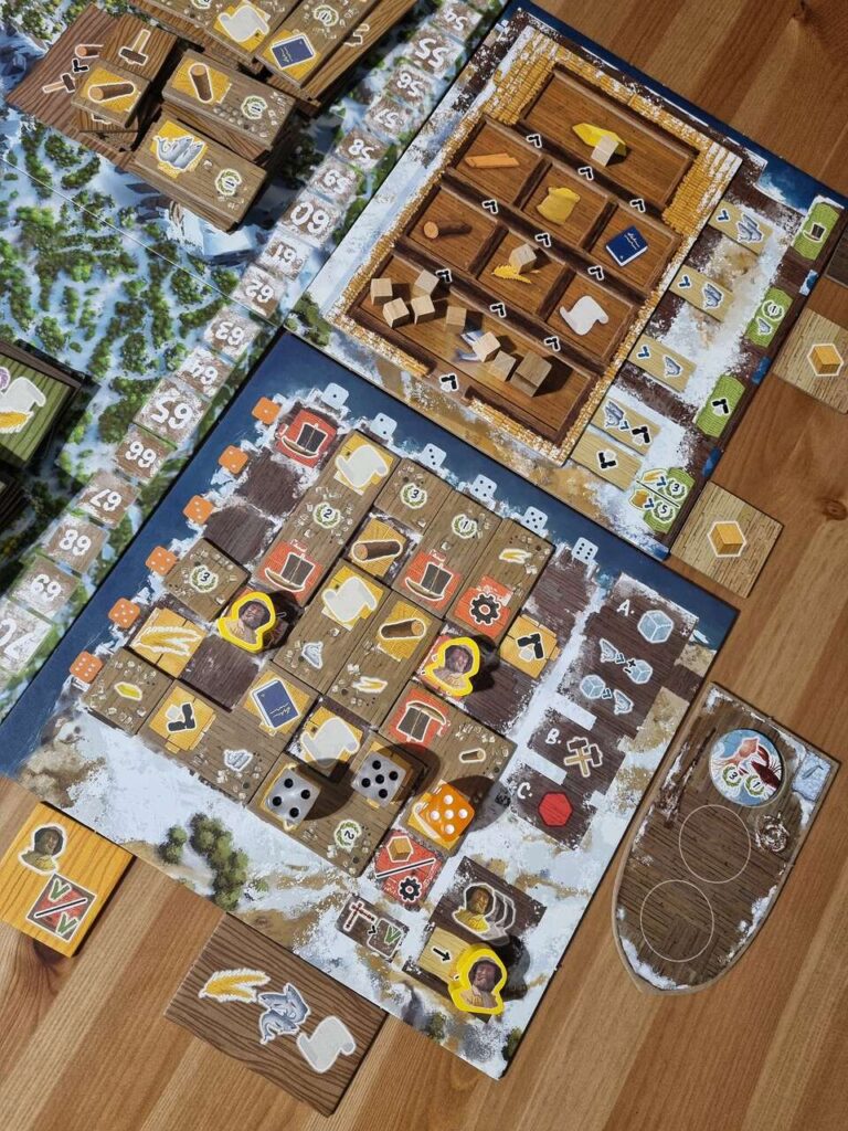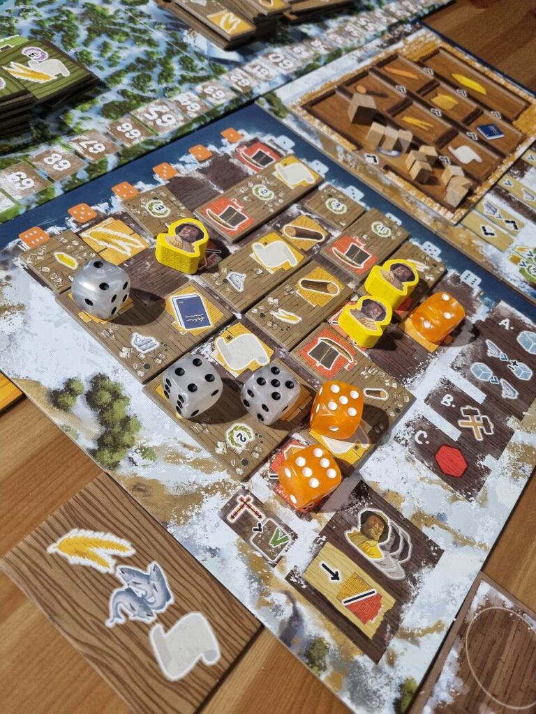 The best thing about this game is that we can add new actions in columns and rows. It’s a kind of mini-game where we try to fill our village with new tiles so that we can do as many actions as possible with one die. This makes us feel that we can do more from round to round. Placing new tiles can also give us a significant boost in resources if we plan it properly.