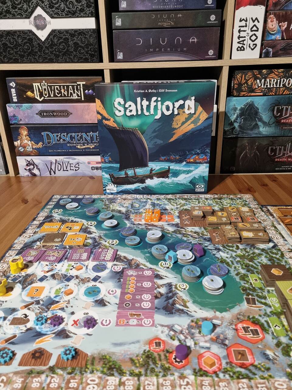 The components available in Saltfjord are very thematic, and you can really feel the Norwegian fjord atmosphere here. Unfortunately, there is no insert in the box, so we have to put everything in zip-lock bags. Just like when fishing in real life, you have to make do with what you have.