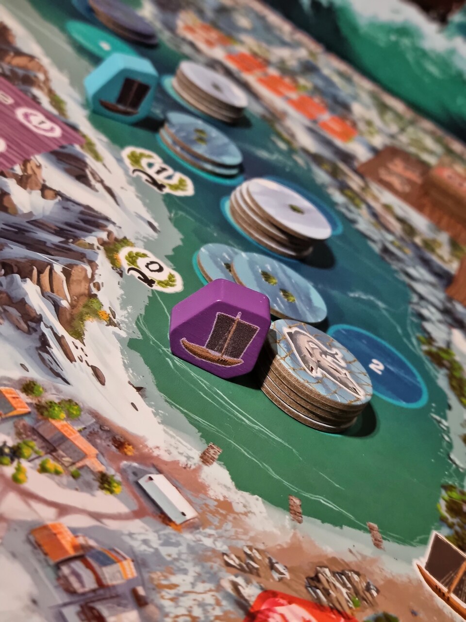 Jeżeli mówimy o zasobach to główną walutą w Saltfjord są ryby. W dowolnym momencie gry możemy ulepszyć ryby na inny surowiec. Możemy też inne surowce zamienić z powrotem na ryby. Ta wymiana pozwoli nam kreatywnie zarządzać zasobami tak by nas było stać na wykonanie wszystkich akcji. Według mnie jest to bardzo ciekawy zabieg.
