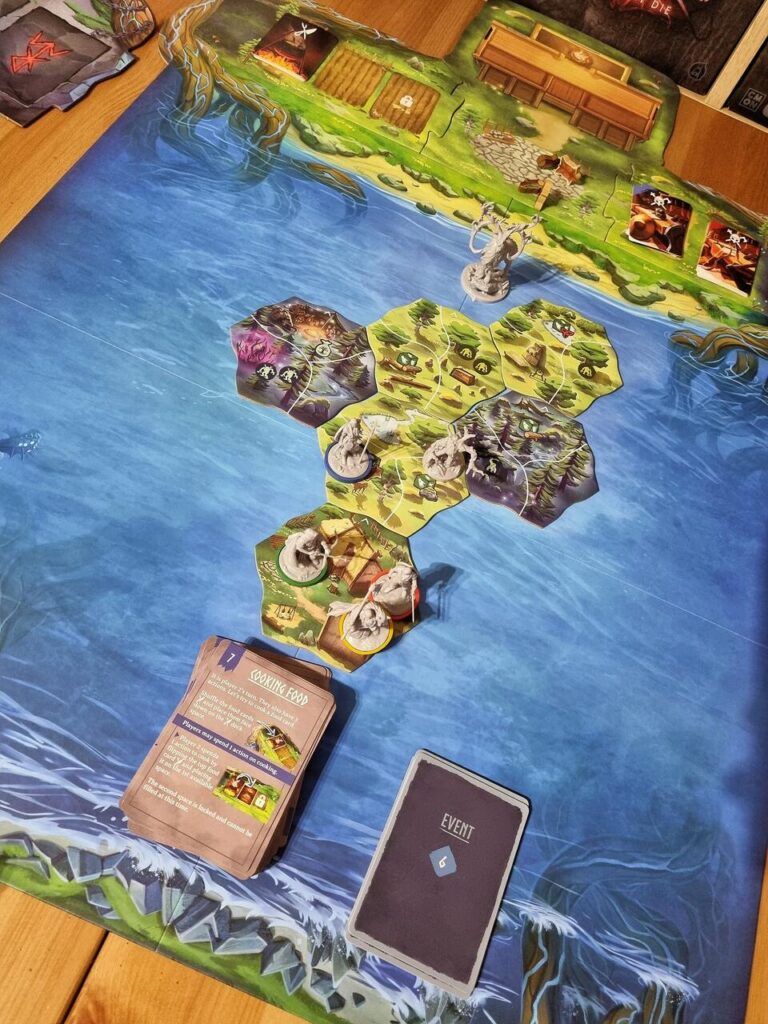 Speaking of which, at the end of each player’s turn, an event card is drawn. As a rule, it’s something negative. For example, enemies may invade, the weather may turn bad, or events may prevent us from cooking. As we all know, a hungry Viking is an angry Viking. I know this from experience.